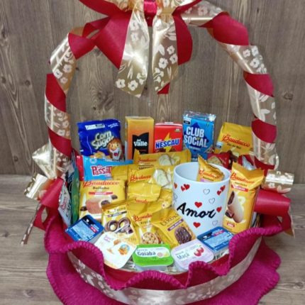 bombons variados – 1 un. caixa de ferrero rocher – 1 un. urso de pelucia – 1 un. cesta vermelha decorada – 1 un.